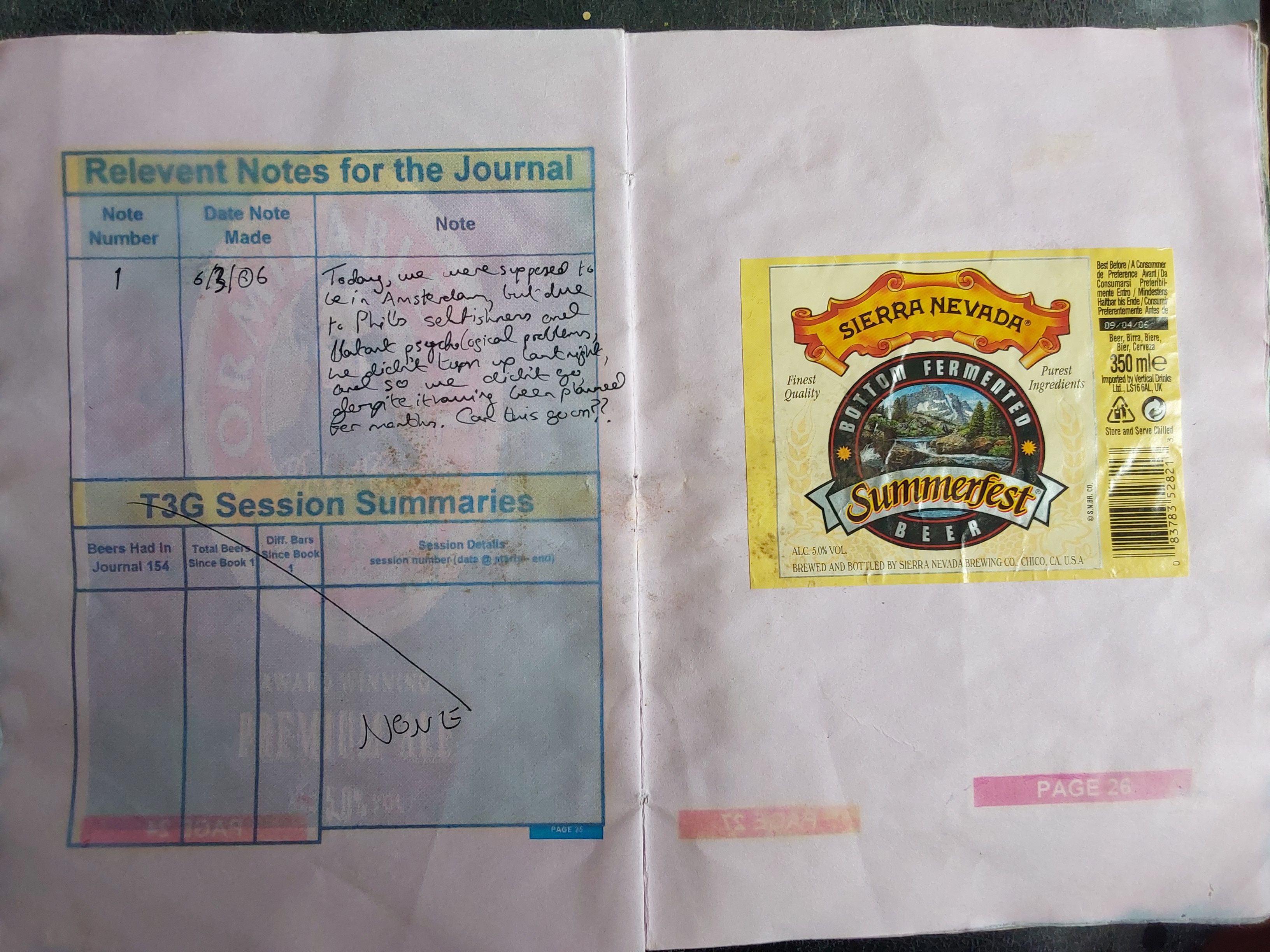 | Date and Time | Container | Pub/Place and Where | Strength ABV | Colour | Score Components | Score | Descriptive word(s) | Book No. |