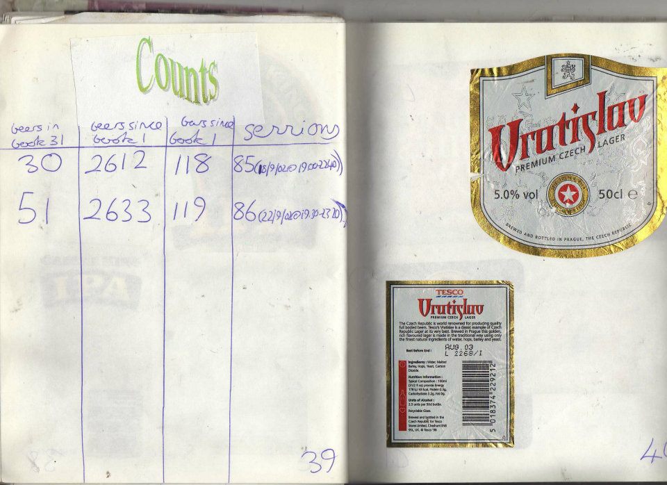| Date and Time | Container | Pub/Place and Where | Strength ABV | Colour | Score Components | Score | Descriptive word(s) | Book No. |