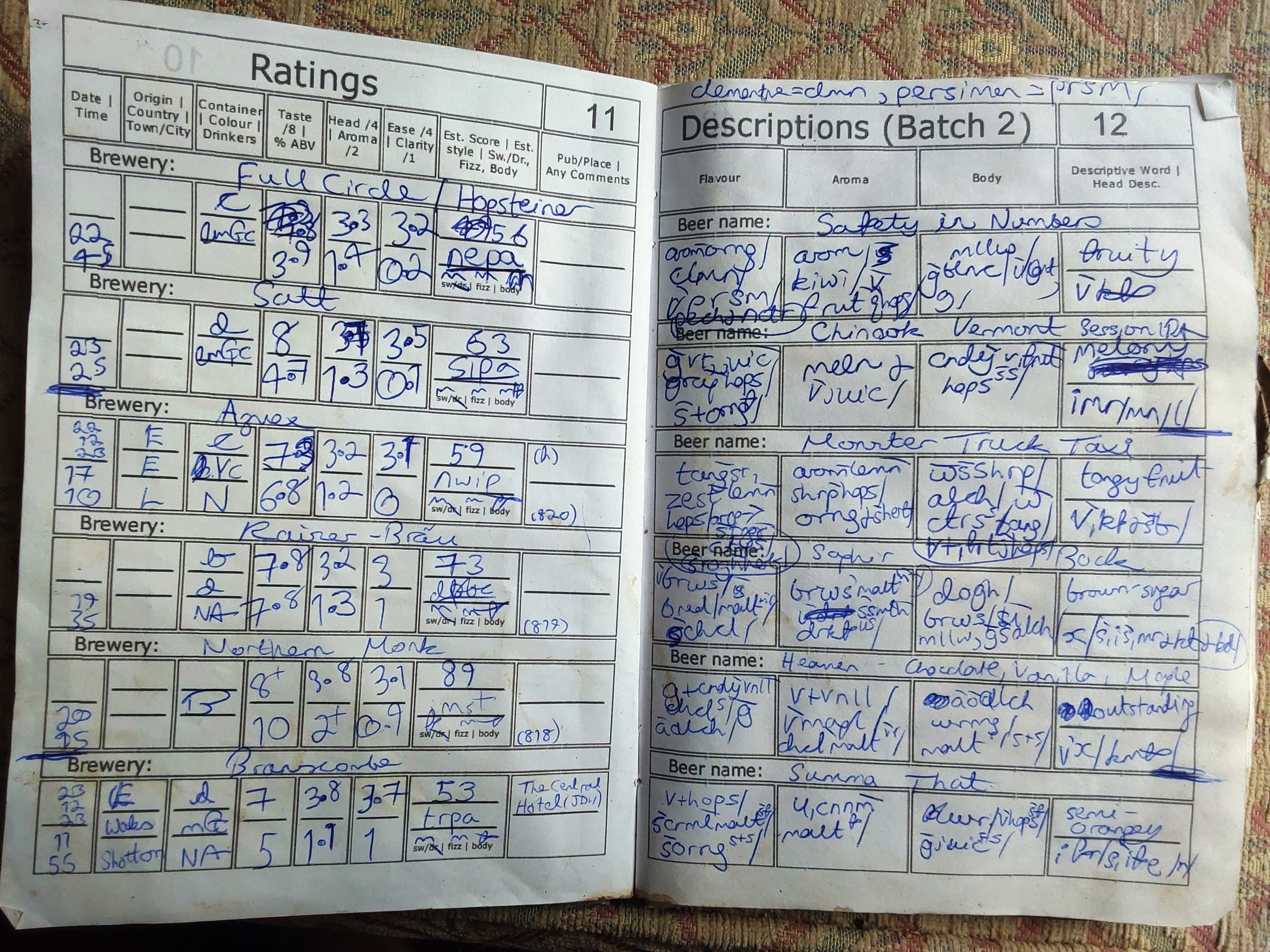 | Date and Time | Container | Pub/Place and Where | Strength ABV | Colour | Score Components | Score | Descriptive word(s) | Book No. |
