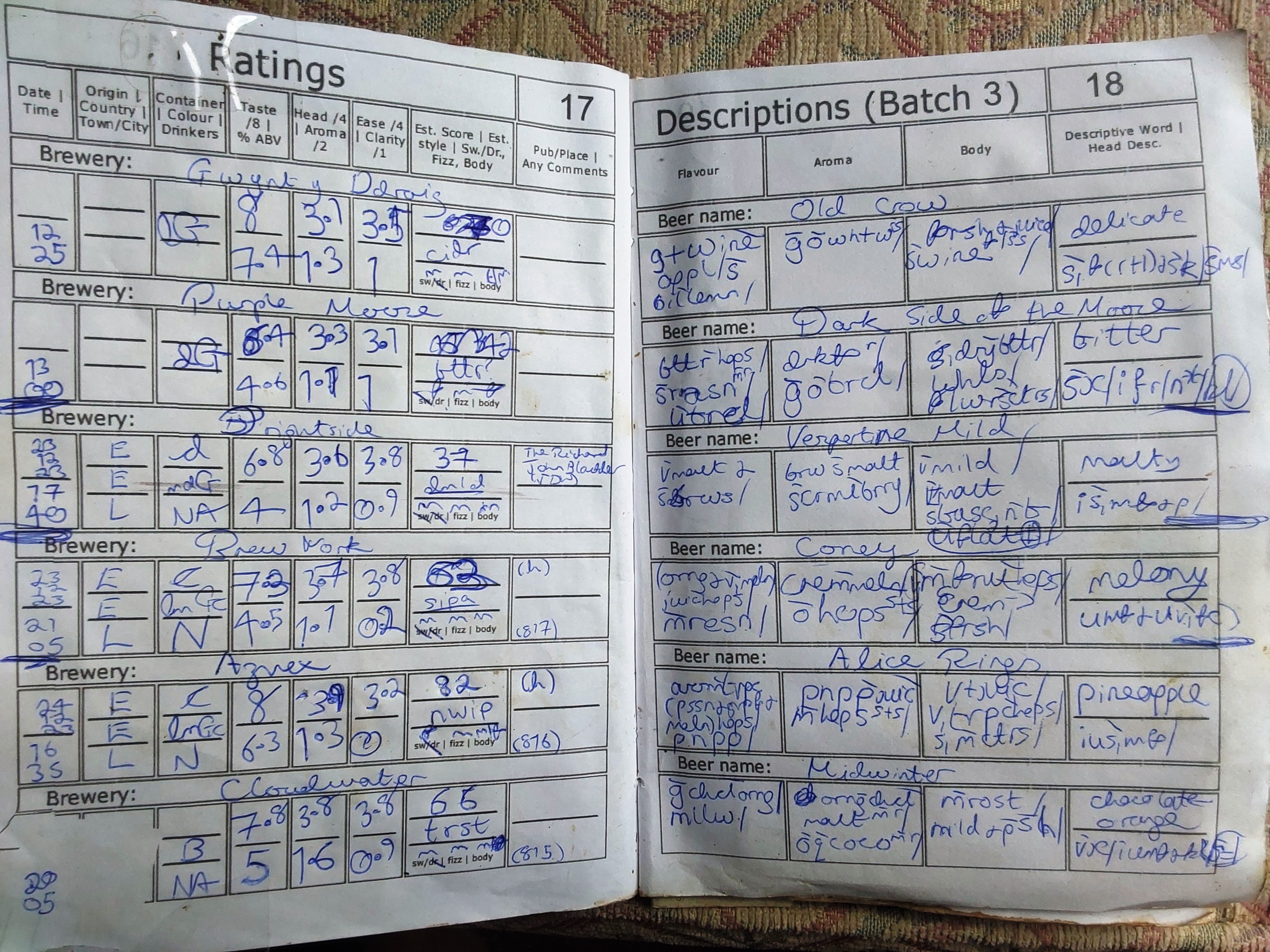 | Date and Time | Container | Pub/Place and Where | Strength ABV | Colour | Score Components | Score | Descriptive word(s) | Book No. |
