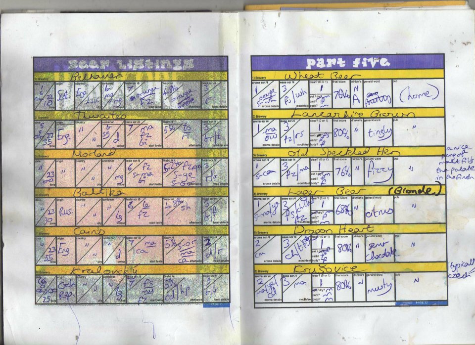 | Date and Time | Container | Pub/Place and Where | Strength ABV | Colour | Score Components | Score | Descriptive word(s) | Book No. |