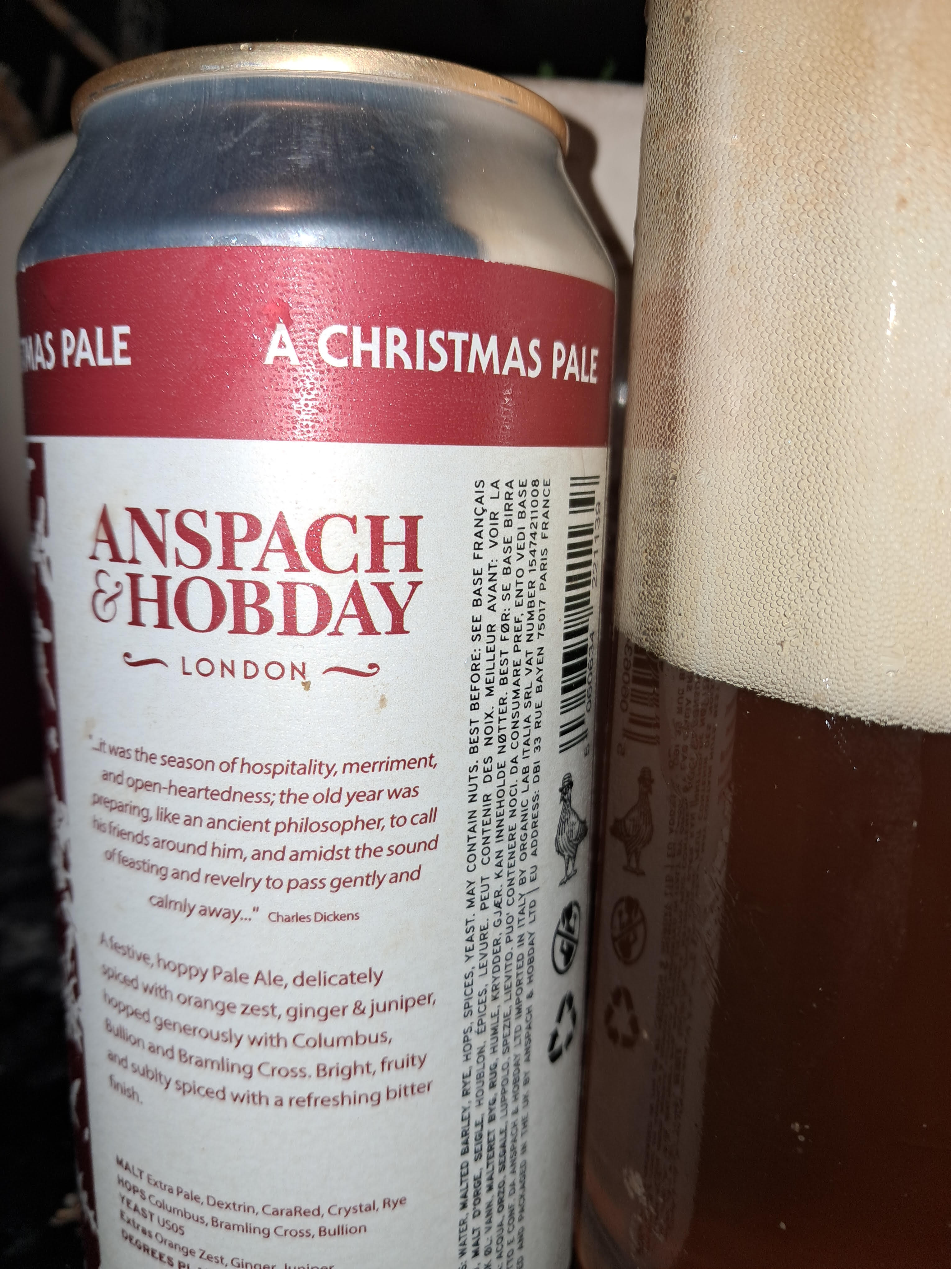 This Orange zest, ginger and juniper Christmas pale ale is/was brewed by Anspach & Hobday in Bermondsey, Greater London, England. It's achieved an overall score of 52.64%. Based on 1 tasting, the average ABV is 4.50%.