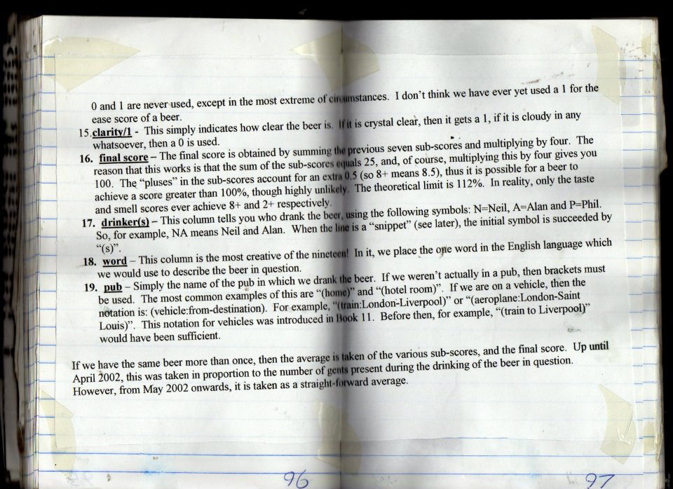 | Date and Time | Container | Pub/Place and Where | Strength ABV | Colour | Score Components | Score | Descriptive word(s) | Book No. |