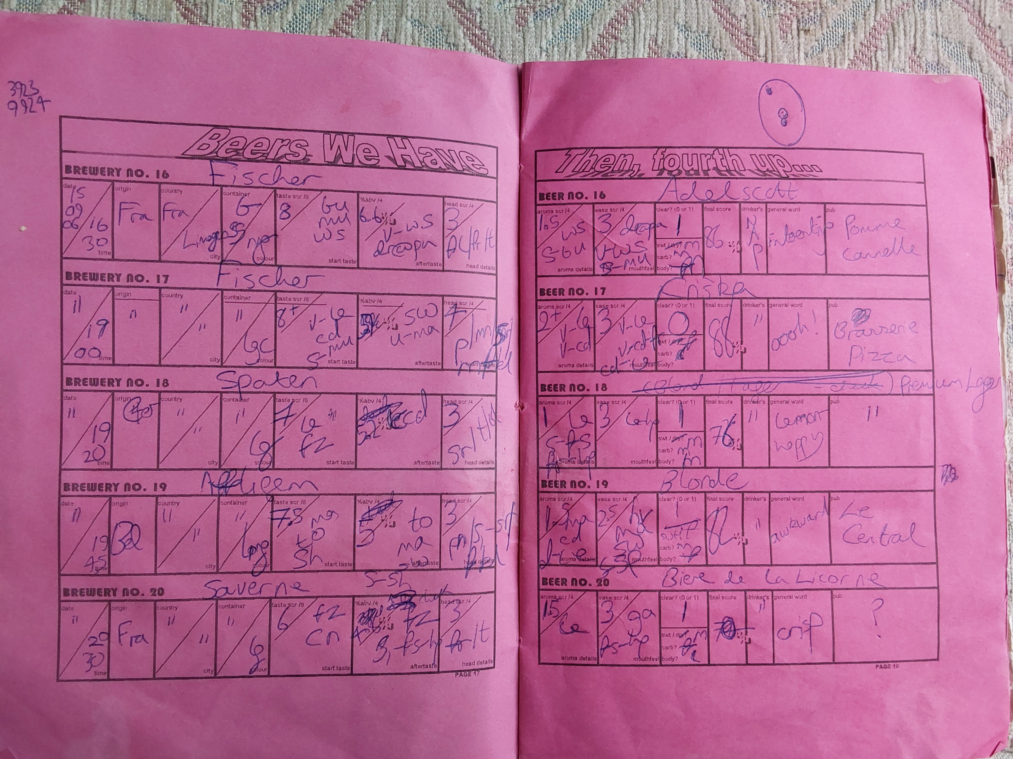 | Date and Time | Container | Pub/Place and Where | Strength ABV | Colour | Score Components | Score | Descriptive word(s) | Book No. |