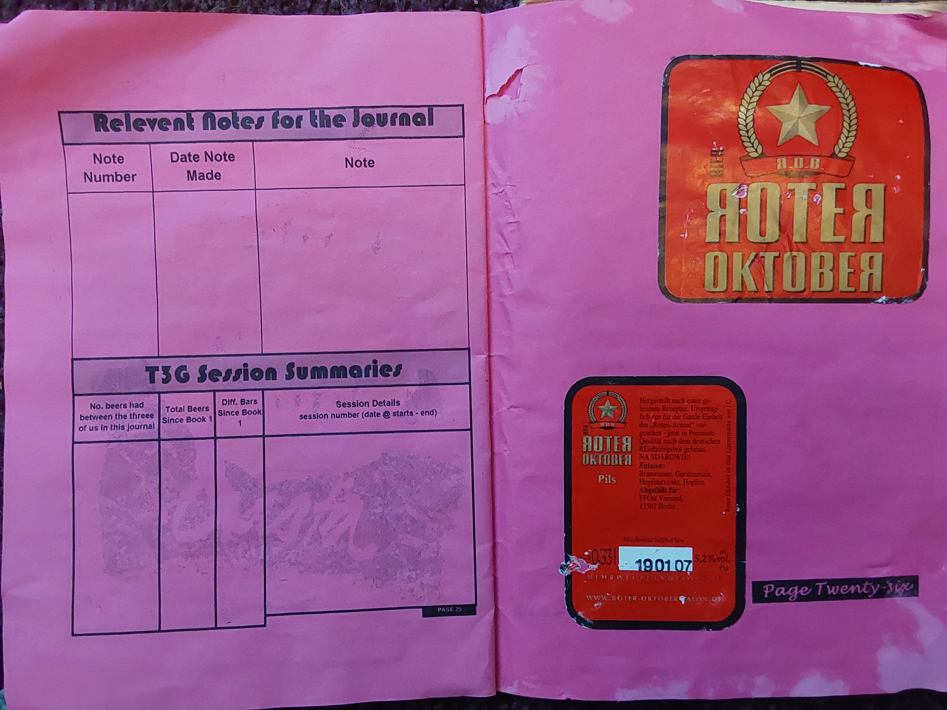 | Date and Time | Container | Pub/Place and Where | Strength ABV | Colour | Score Components | Score | Descriptive word(s) | Book No. |